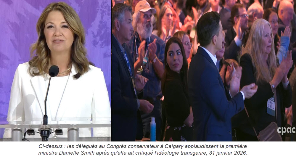 Par exemple, quelques heures plus tôt, sur la même scène, la première ministre de l'Alberta, Danielle Smith, a reçu une ovation debout pour avoir critiqué l'idéologie du genre et déclaré :