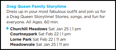 Drag Queen Story Hour events are being planned even as we speak in four local Mississauga City Library Branches this month and next. Here is the advertisement: