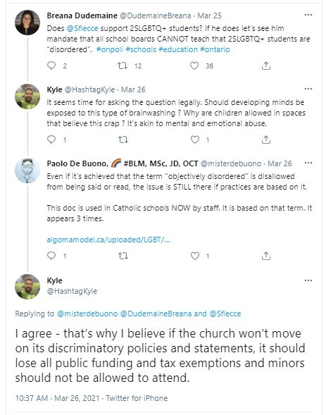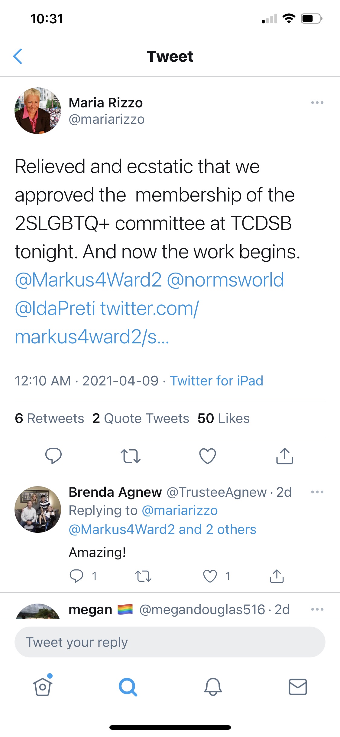 - Trustees voted to establish an official sub-committee called the “2SLGBTQ+ Committee”. This committee will advise the board on how it should conduct ongoing homosexual and transgender activism within Catholic Schools. The committee is stacked with practicing homosexuals who’ve publicly opposed Catholic teaching, such as Kyle Iannuzzi, who even said it should become illegal for minors to attend a Catholic Church.