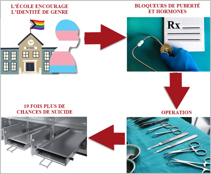 Nous savons donc que le mensonge selon lequel l’affirmation de l’identité transgenre chez les enfants « sauve des vies » est grossier. C’est le contraire qui est vrai. Lorsque les enseignants affirment l’identité transgenre des enfants, cela conduit un grand nombre d’entre eux à prendre des bloqueurs de puberté et des hormones, et finalement, beaucoup d’entre eux s’engagent sur la voie de la mutilation chirurgicale, où leur probabilité de se suicider est multipliée par près de 20 !