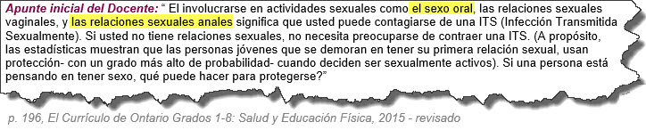 CLC ha estudiado el currículo propuesto para el 2015 y hemos encontrado que los elementos controversiales del programa que enfurecieron a los padres de familia en el 2010 continúan igual que antes, cuando el currículo fue escrito bajo la dirección del pornógrafo infantil confeso Benjamin Levin que en aquel entonces era Vice-Ministro de Educación. No ha habido cambio alguno, palabra por palabra, y con la misma edad inapropiada para el nivel de madurez de los estudiantes en esas edades y grados escolares. La única diferencia ahora es que Kathleen Wynne ha hecho el currículo aún más explícito y más inapropiado para la edad que antes, aumentando dramáticamente las menciones a la teoría de la “Identidad de Género”, “identidades” sexuales y “orientaciones”.